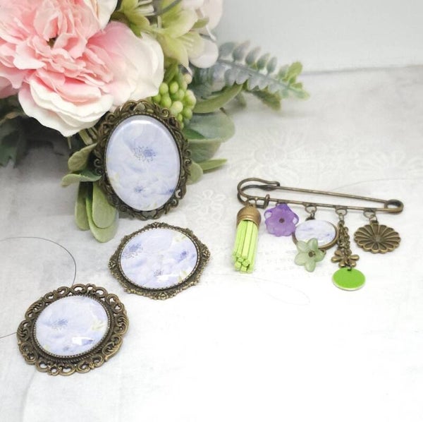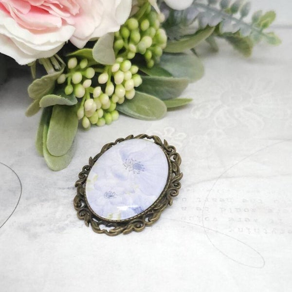 Nos broches ovales, s'inspirent de la forme des broches camée d'antan. Elles se composent d'un support ovale sur lequel est fixé un cabochon en verre avec effet loupe ; effet qui met en valeur le motif réalisé sous le verre.