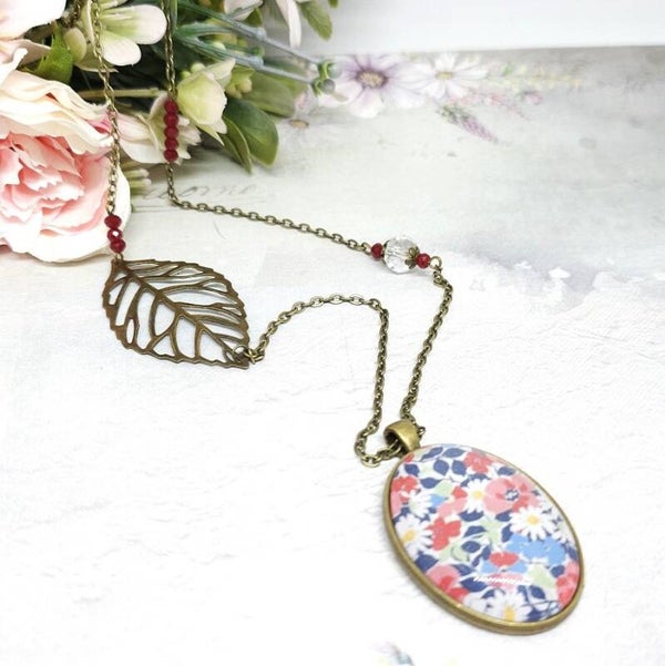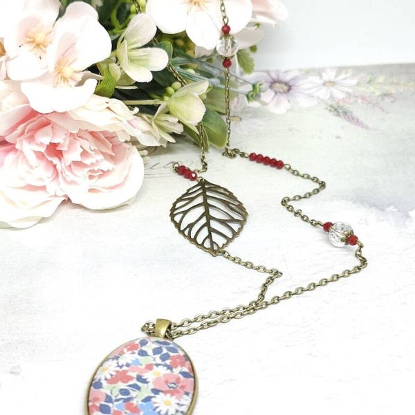 Sautoir avec cabochon en verre, Forme ovale, Modèle Anémone rouge