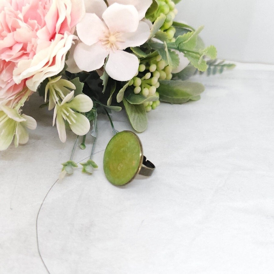 Cette bague ronde est composée d'un support en métal de couleur bronze antique réglable et d'un mélange de d'encre verte et jaune.