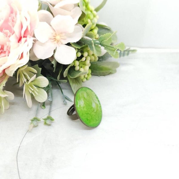 Cette bague ronde est composée d'un support en métal de couleur bronze antique réglable et d'un mélange de d'encre verte et nacrée.