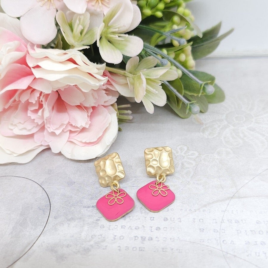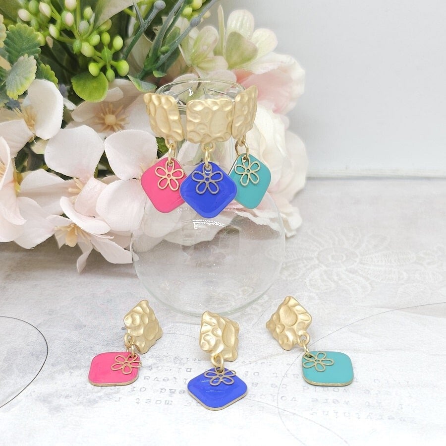 Cette paire de boucles d'oreilles pendantes est composée d'une breloque losange émaillée et colorée de 14mm et d'une breloque fleur en métal doré de 8mm.