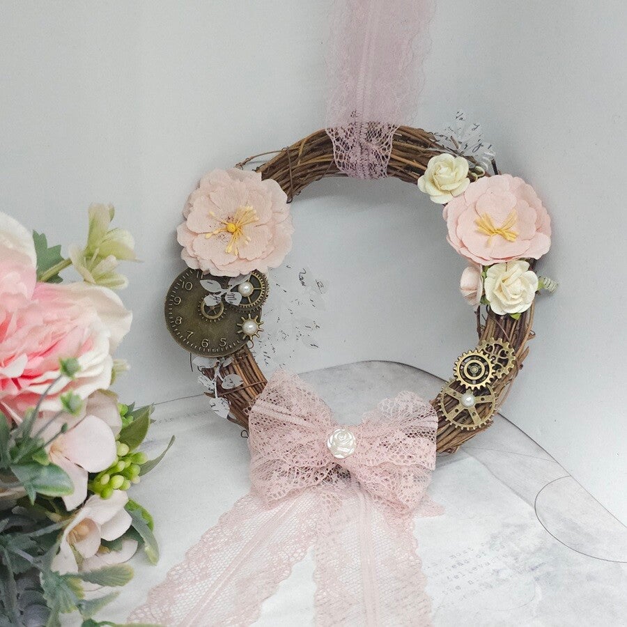 Cette couronne en rotin est agrémentée d'un nœud en dentelle vieux rose et de sa perle nacrée en forme de fleur.