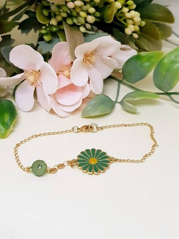 Ce bracelet simple est composé d'une chaine maille fine agrémentée par une breloque connecteur marguerite verte de 15mm, d'une petite chaine à pastilles et d'une perle polaris incrusté de cristaux Swarovski de couleur jaune.