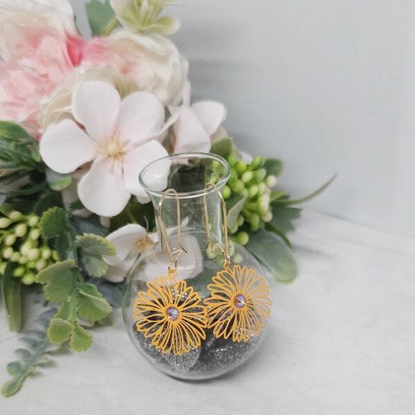 Ces paires de boucles d'oreilles pendantes sont composées d'une estampe fleur colorée agrémenté d'un strass en cristal.