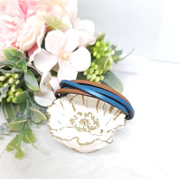 Ce bracelet est composé de deux bandes de cuir plat, l'une de couleur bleu et la seconde de couleur fauve.