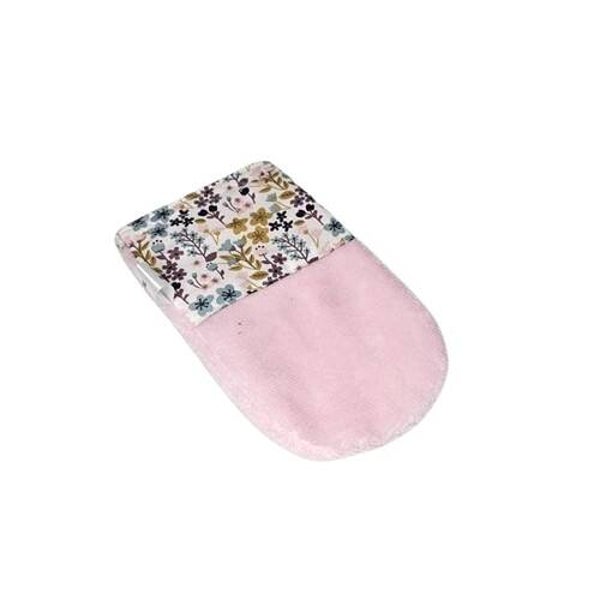 Ce petit gant est réalisé dans une éponge bambou toute douce de couleur rose et est agrémenté avec un biais en tissu imprimé fleurs dans les tons automnales sur un fond blanc.