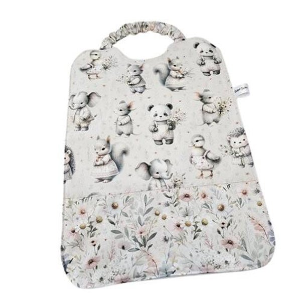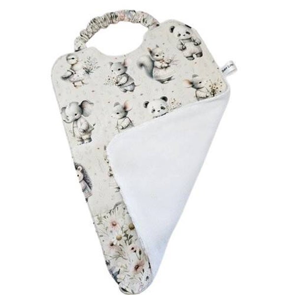 Ce grand bavoir est réalisé dans un tissu à l'imprimé doux et délicat aux motifs animaliers dans les tons pastels sur un fond blanc cassé pour la partie haute de ce bavoir et dans un tissu à l'imprimé fleuri pour la partie basse, et dans une éponge bambou toute douce de couleur blanche.
