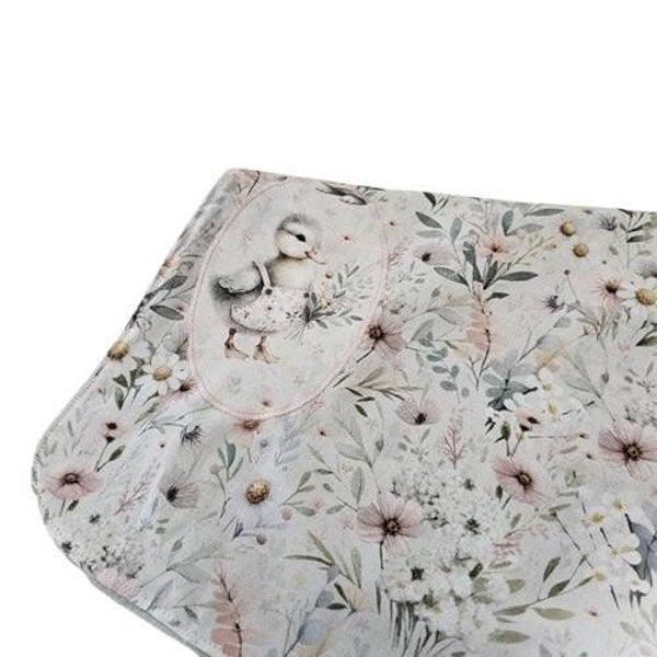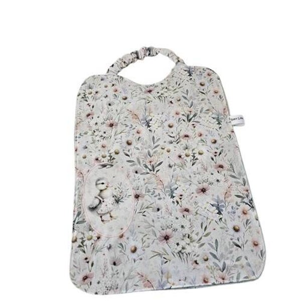 Une applique, motif caneton et son bouquet de fleurs, est cousus sur la partie gauche du bavoir.