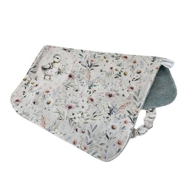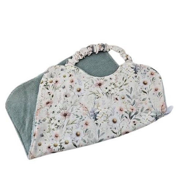 Ce grand bavoir est réalisé dans un tissu à l'imprimé fleuri aux tons pastels et dans une éponge bambou toute douce de couleur vert amande.