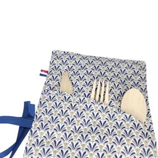 Cette pochette à couvert est réalisée avec un coton enduit imprimé géométrique bleu et doré sur un fond blanc.