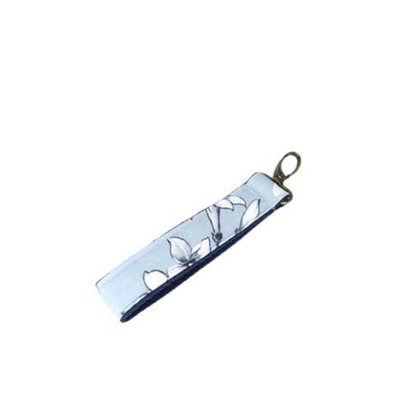 Ce porte clés est réalisé dans un tissu imprimé marguerites blanches et bleu marine sur un fond jaune et avec une sangle de couleur bleu marine.