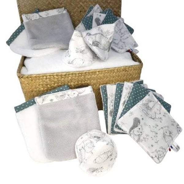 Ce tipi est réalisé dans un tissu coton imprimé bébés animaux comme dessinés au crayon noir sur un fond blanc et dans une éponge bambou toute douce de couleur grise.