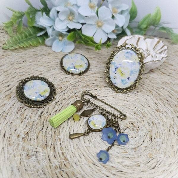 Nos broches rondes, vous sont proposées en deux versions : une version avec un cabochon en verre de 25mm sur un support dentelée et une version avec un cabochon en verre de 30mm sur un support simple ou octogonal.