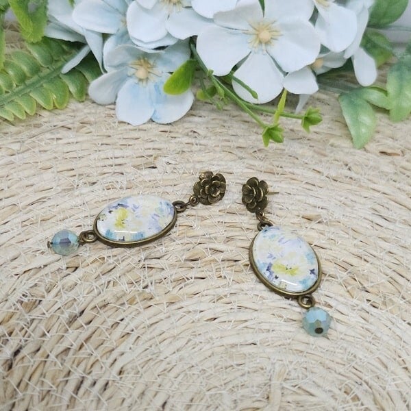 Nos boucles d'oreilles pendantes sont réalisées avec des supports en métal de couleur bronze, agrémentés d'un cabochon rond en verre et d'une illustration.