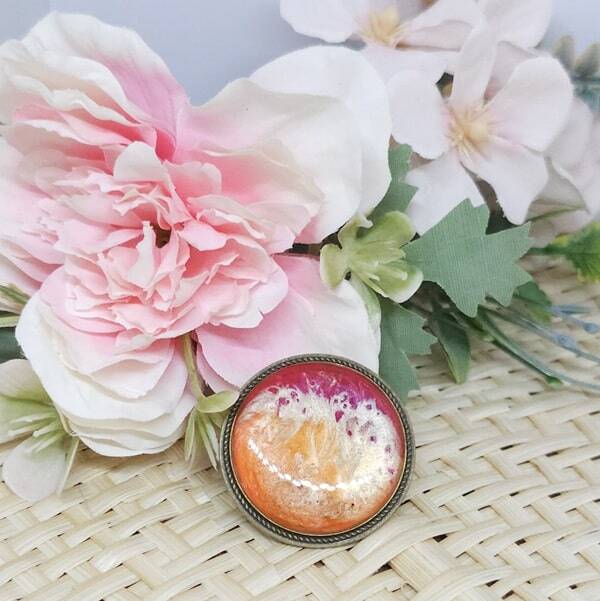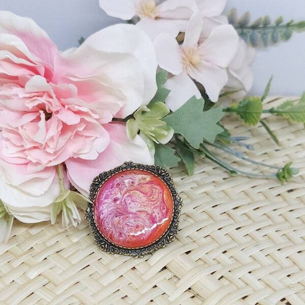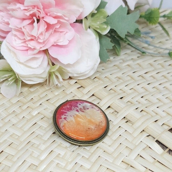 Cette broche ronde est composée d'un support en métal de couleur bronze antique avec une bordure simple et d'un mélange de peinture à l'huile dans les dégradés de fuchsia, orange et nacré.