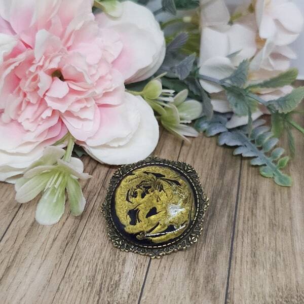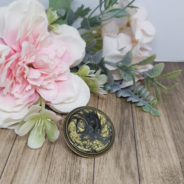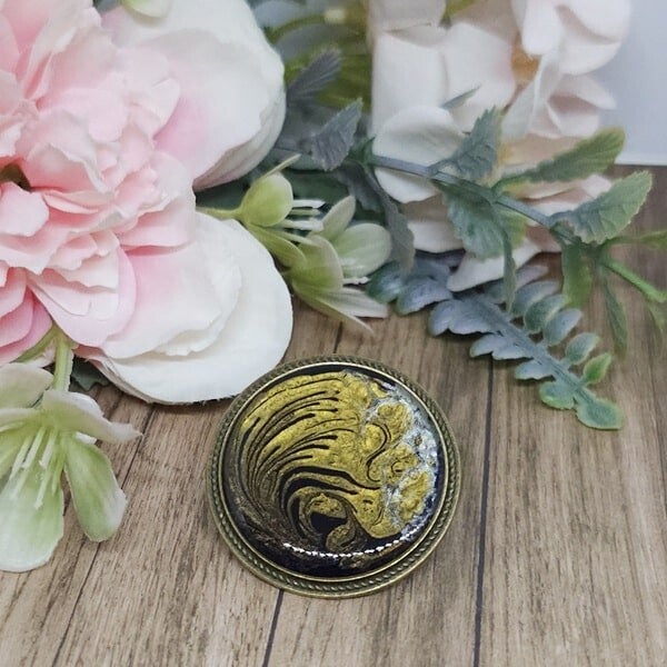 Cette broche ronde est composée d'un support en métal de couleur bronze antique avec une bordure simple et d'un mélange de peinture à l'huile dans les dégradés de noir et doré (arches noires).