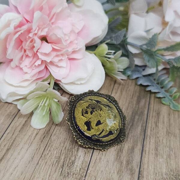 Cette broche ronde est composée d'un support en métal de couleur bronze antique avec une bordure travaillée et d'un mélange de peinture à l'huile dans les dégradés de noir et doré.