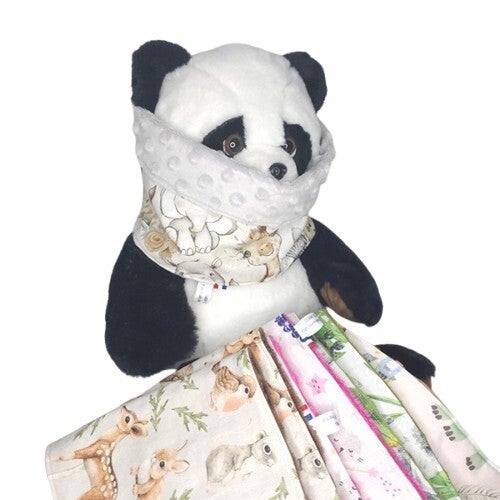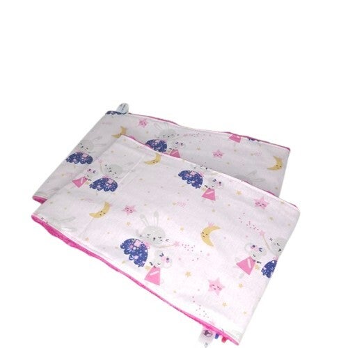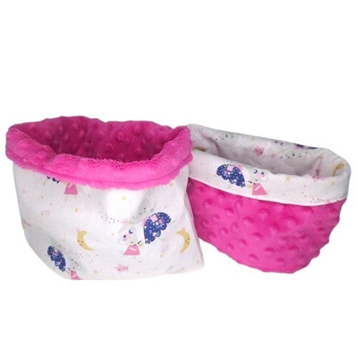 Ce tour de cou est réalisé dans un tissu imprimé lapin danseuse et dans un tissu Minky (polaire) de couleur fuchsia.