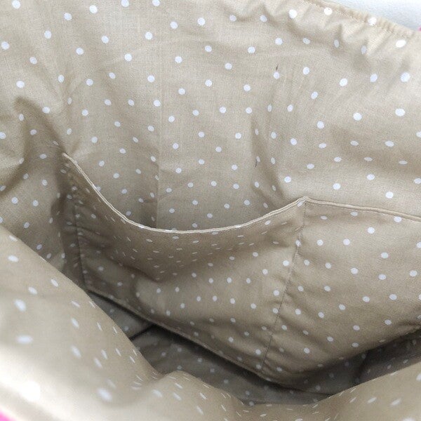 Une grande poche réalisée dans le même tissu à pois est cousue à l'intérieur et présente deux compartiments.