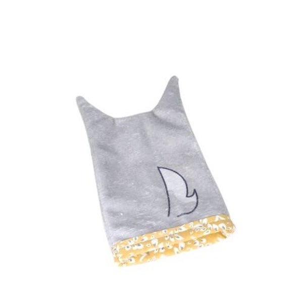 Ce gant est réalisé dans un tissu imprimé en éponge bambou et agrémenté d’un biais en coton imprimé feuillage blanc et gris sur un fond jaune.
