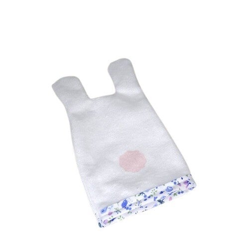 Ce gant est réalisé dans un tissu imprimé en éponge bambou et agrémenté d’un biais en coton imprimé papillon rose et mauve sur un fond blanc.