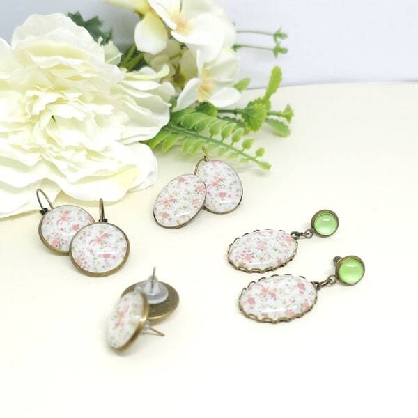 Boucles d'oreilles pendantes avec cabochon en verre, Modèle Aubépine