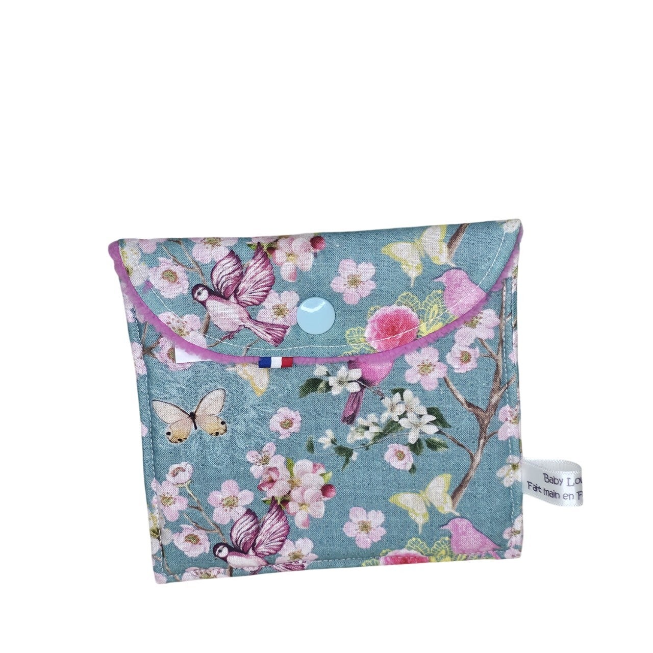 La pochette est fermée par un bouton pression de couleur bleu ciel.