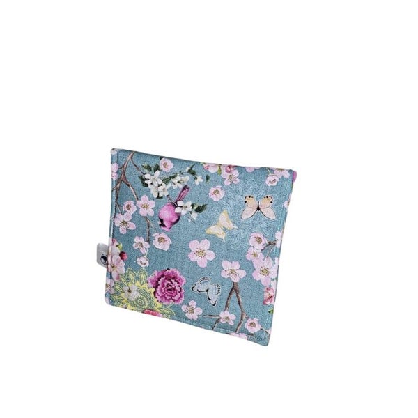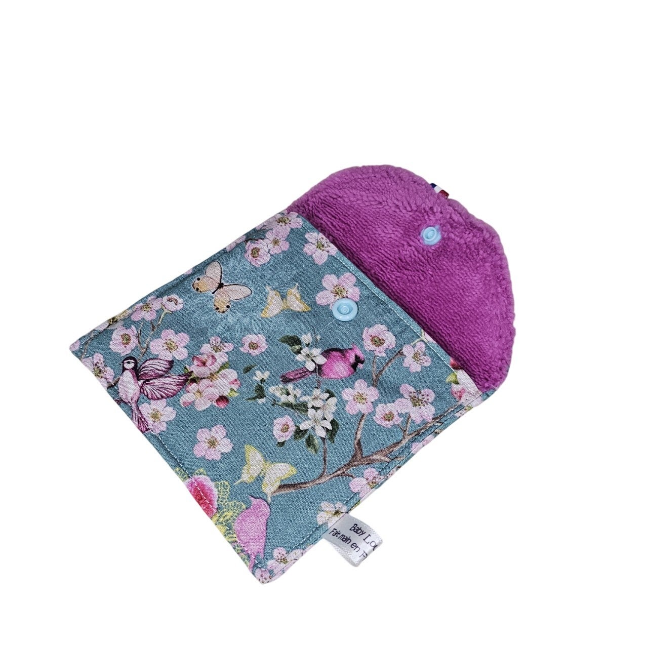 Cette pochette est réalisée dans un tissu imprimé fleur de cerisier sur un fond vert turquoise et dans une éponge bambou toute douce de couleur fuchsia.