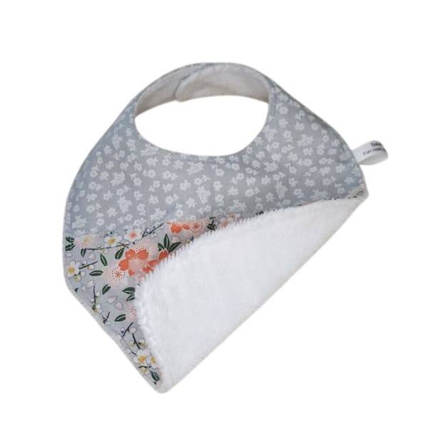 Ce modèle est réalisé dans un tissu imprimé fleurs de ceriser dans les tons de orange pour la partie basse et dans un tissu petites fleurs blanches sur un fond gris pour la partie haute de ce bavoir.