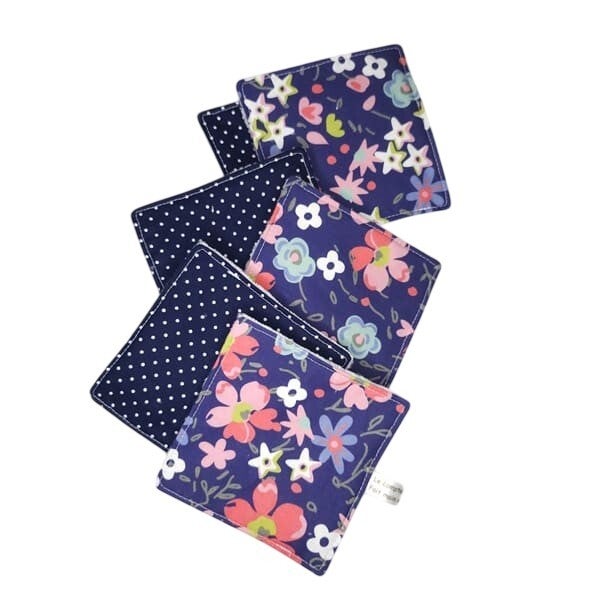 - dans un tissu imprimé fleurs colorés sur un fond bleu marine et dans une éponge bambou de couleur blanche (x3)