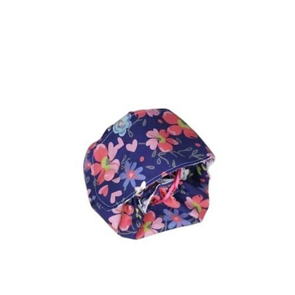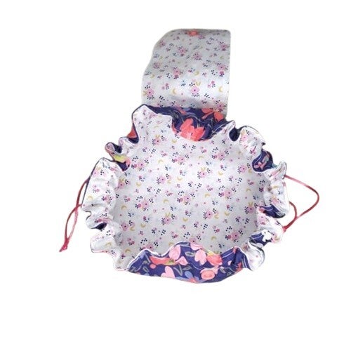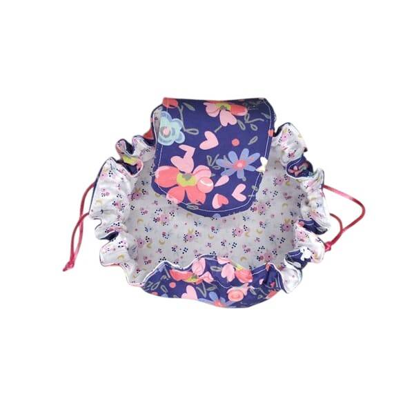 Ce pochon est réalisé dans un tissu imprimé grandes fleurs colorées sur un fond bleu marine pour la partie extétieure et dans un tissu à l'imprimé fleuri sur un fond blanc pour la partie intérieure.