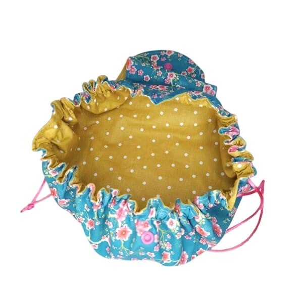 Ce pochon est réalisé dans un tissu imprimé fleurs de cerisier rose sur un fond bleu turquoise pour la partie extétieure et dans un tissu à l'imprimé pois blanc sur un fond ocre pour la partie intérieure.