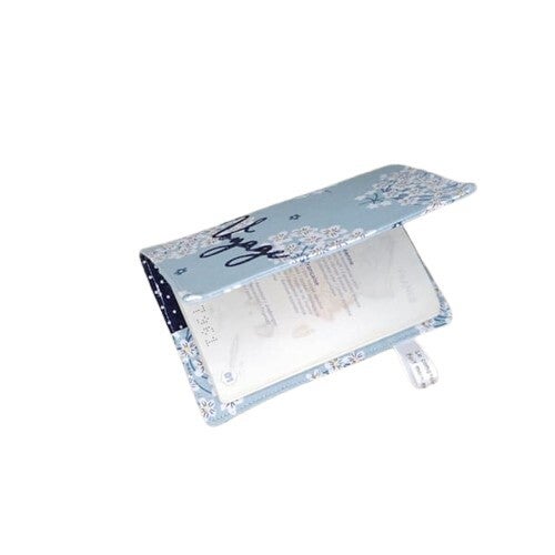 Ce protège-passeport est confectionné dans un tissu orné d'un bouquet de fleurs blanches sur un fond bleu ciel, et doublé d'un tissu à pois blancs sur un fond bleu marine.