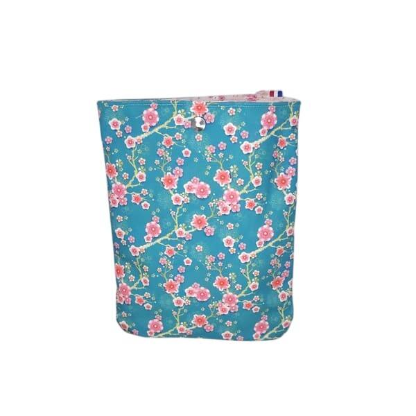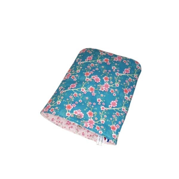 Cette pochette à livre de poche ou liseuse est réalisée dans un tissu à l'imprimé fleurs de cerisier fuchsia sur un fond bleu turquoise pour la partie extérieure et dans un tissu à l'imprimé petites fleurs roses sur un fond rose pour la partie intérieure.