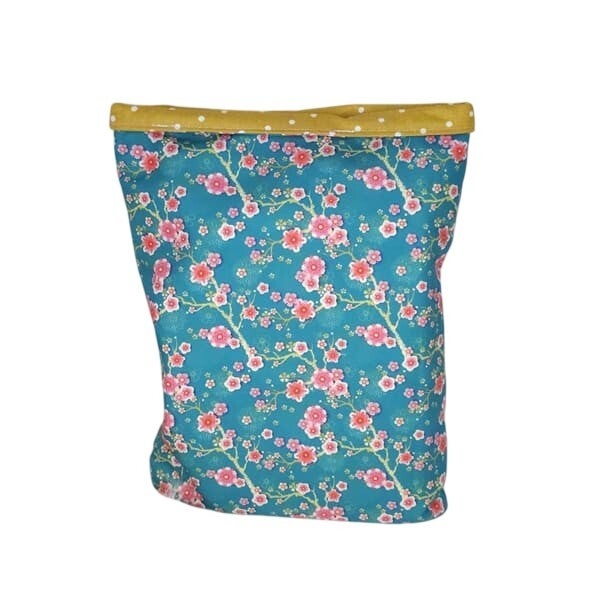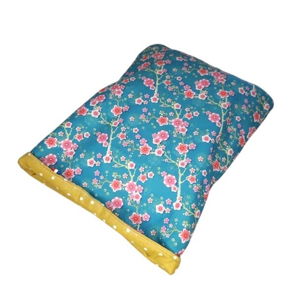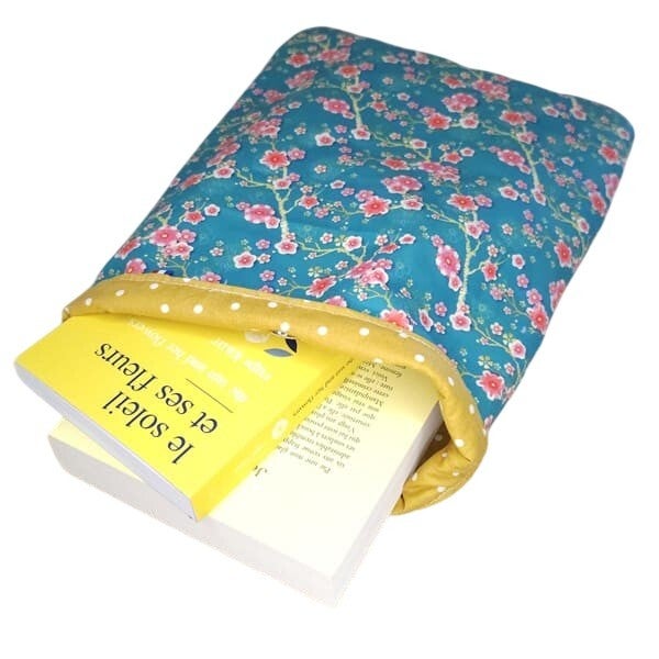 Cette pochette à livres brochés est réalisée dans un tissu à l'imprimé fleurs de cerisier fuchsia sur un fond bleu turquoise pour la partie extérieure et dans un tissu à pois blanc sur un fond ocre pour la partie intérieure.